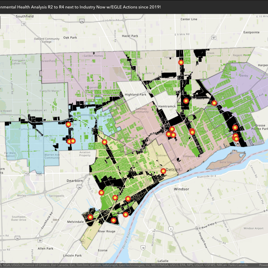 Updated with FOIA'd EGLE Violation data Nov 9, 2025 - The map shows R2 residential zones in green and industrial zones in black, revealing heavy overlap in Districts 4, 5, and 6, where family homes sit beside factories and truck routes. The proposed “Let’s Build More Housing, Detroit” ordinance would make multifamily housing a by-right use in R2 areas, allowing higher-density development with ...